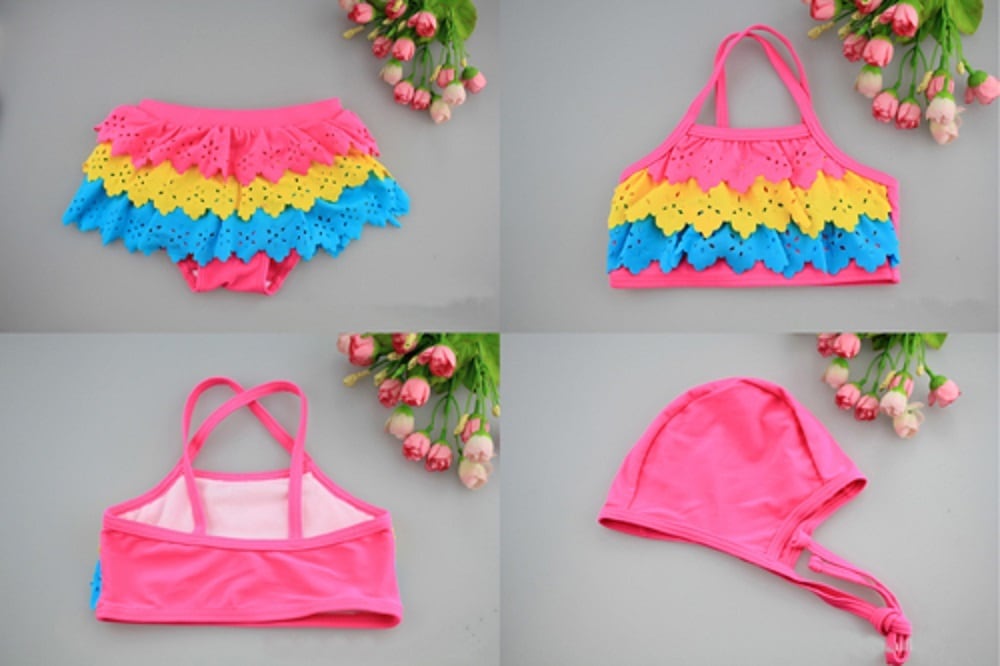 【検索用】子供水着 白 ピンク 帽子 キャップ 可愛い かわいい 海 プール 3点セット 90 100 110 120 130 140 ティアードフリル