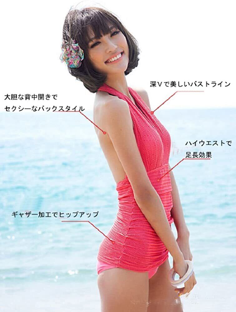 前から見たら繋がっているけど、後ろから見たら大胆な背中見せがセクシーギャザー加工がされているからしっかりヒップアップにも見せてくれます!!